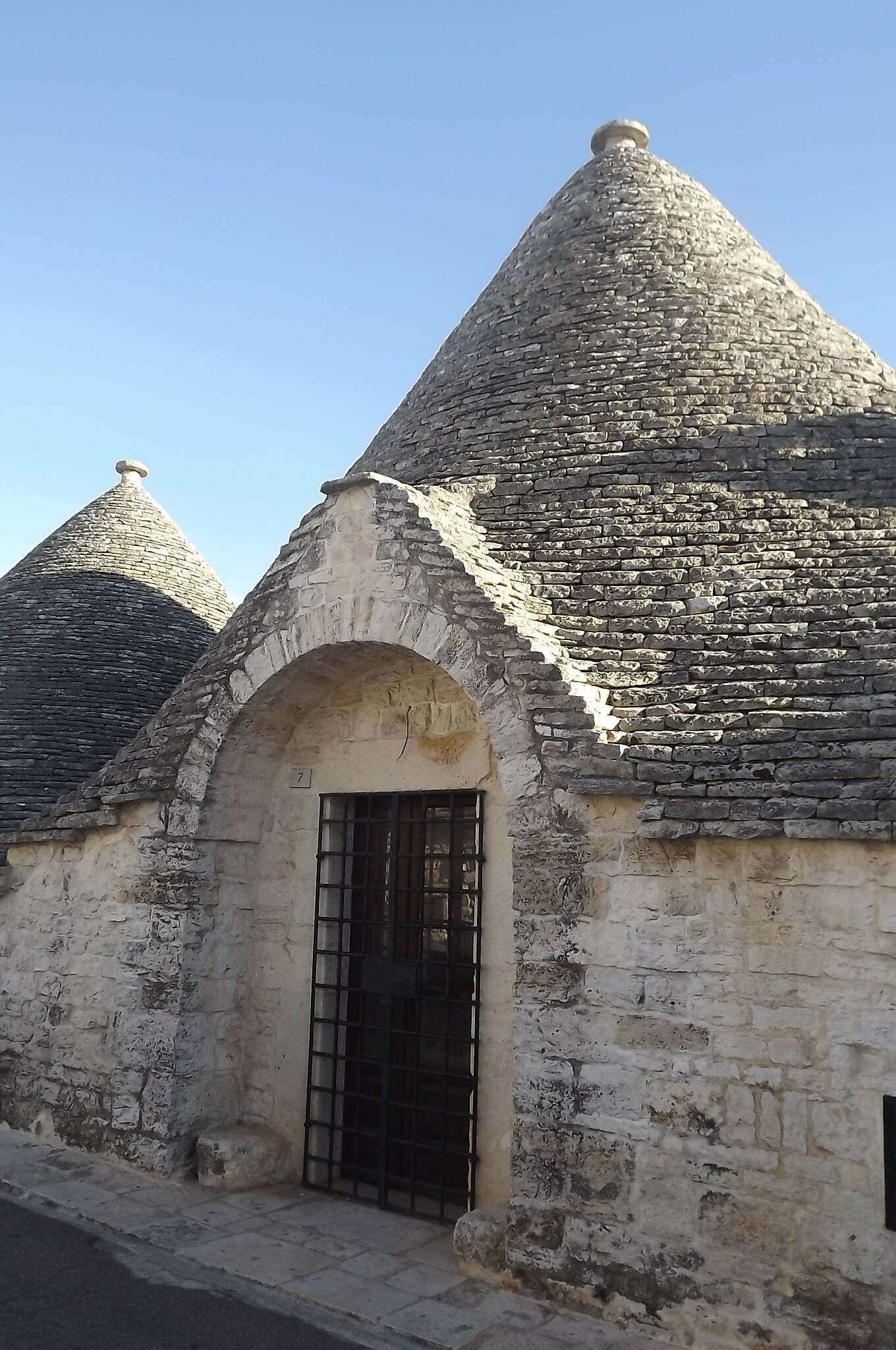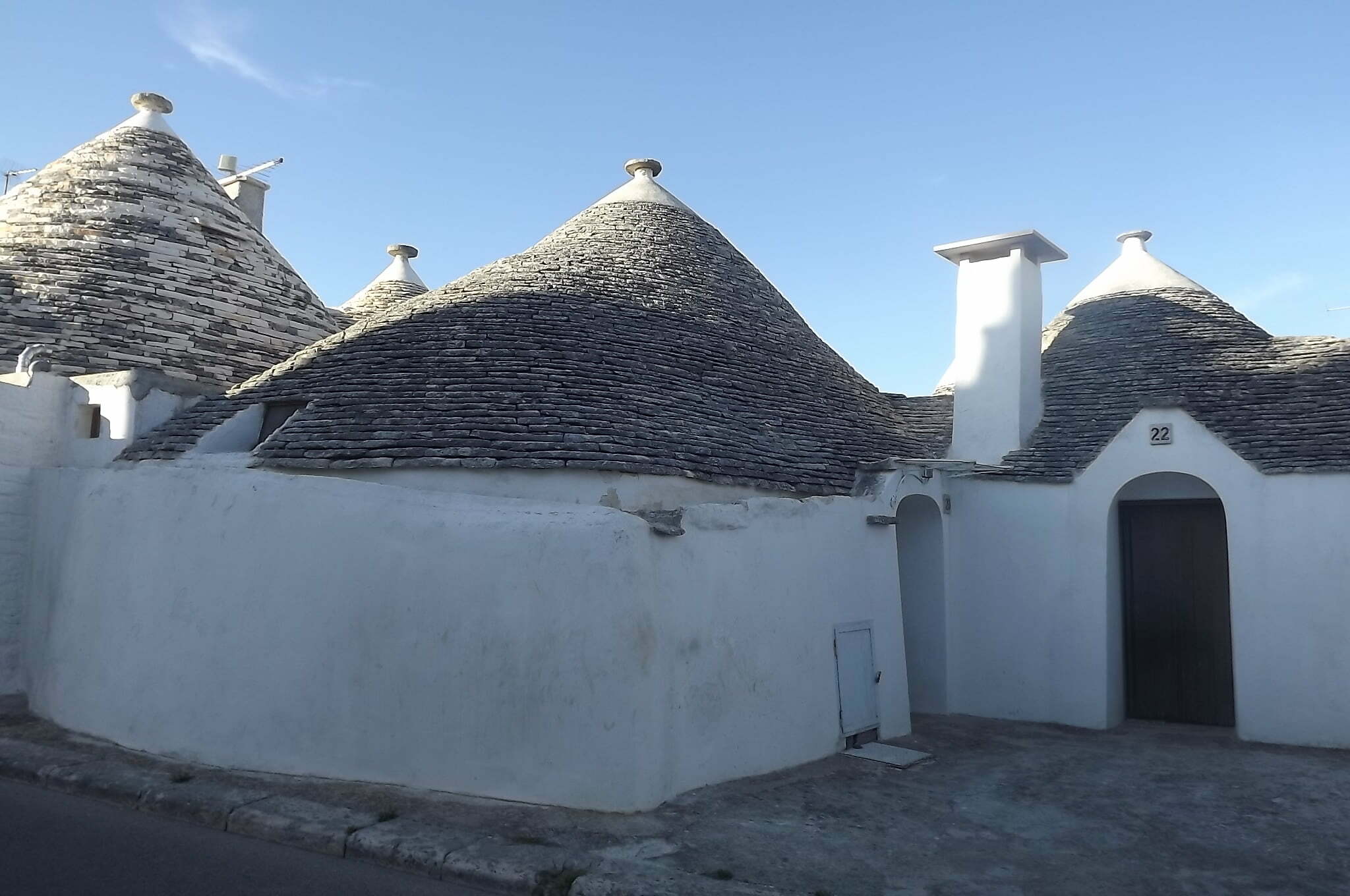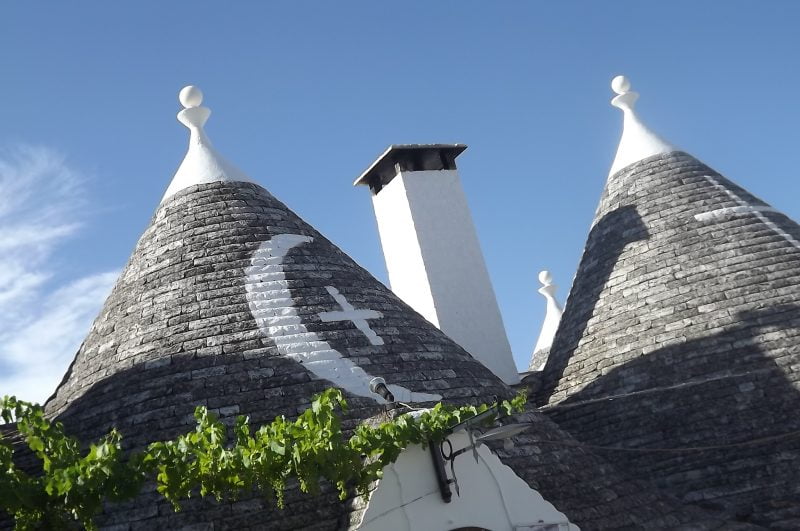 Fotografando i vari trulli mi sono chiesta che cosa rappresentassero i simboli disegnati in calce sui pinnacoli. Sono simboli magici e propiziatori di origine sia cristiana che pagana, ai quali sono stati attribuiti tra i vari poteri la protezione della famiglia e la venerazione di divinità per i raccolti. Sono stati classificati nel 1940 e suddivisi in primitivi (il candeliere semplice ebraico, la croce raggiata, le iniziali I e H de Jesus infisse in un cerchio che rappresenta il mondo e la croce ad albero che unisce i mondi celeste, terreno e degli inferi), magici (Giove, Venere, Toro, Mercurio, Saturno, Omega, Tridente), cristiani (Chrismon, il cuore trafitto di Maria, l’Ostia raggiata con la scritta IHS ed il simbolo del Sole-Cristo), pagani, ornamentali e grotteschi.